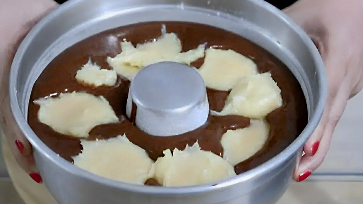 - Transfira essa massa para uma forma de 22cm de diâmetro, com furo central, previamente untada e enfarinhada. Distribua sobre a massa, colheradas do recheio de coco reservado.