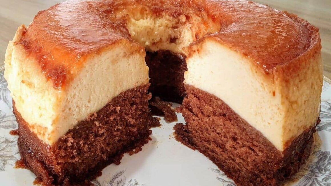 - Posicione uma colher ou espátula por cima da forma caramelizada que já está com a massa do bolo e vá despejando devagar por cima dela, a mistura do pudim, para que caia suavemente na forma.