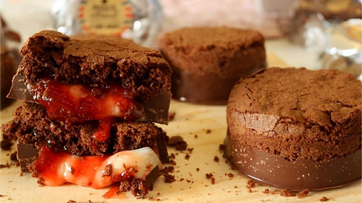 - Coloque uma camada de geleia de morango no centro de cada círculo de massa e cubra com uma camada de recheio de ninho.