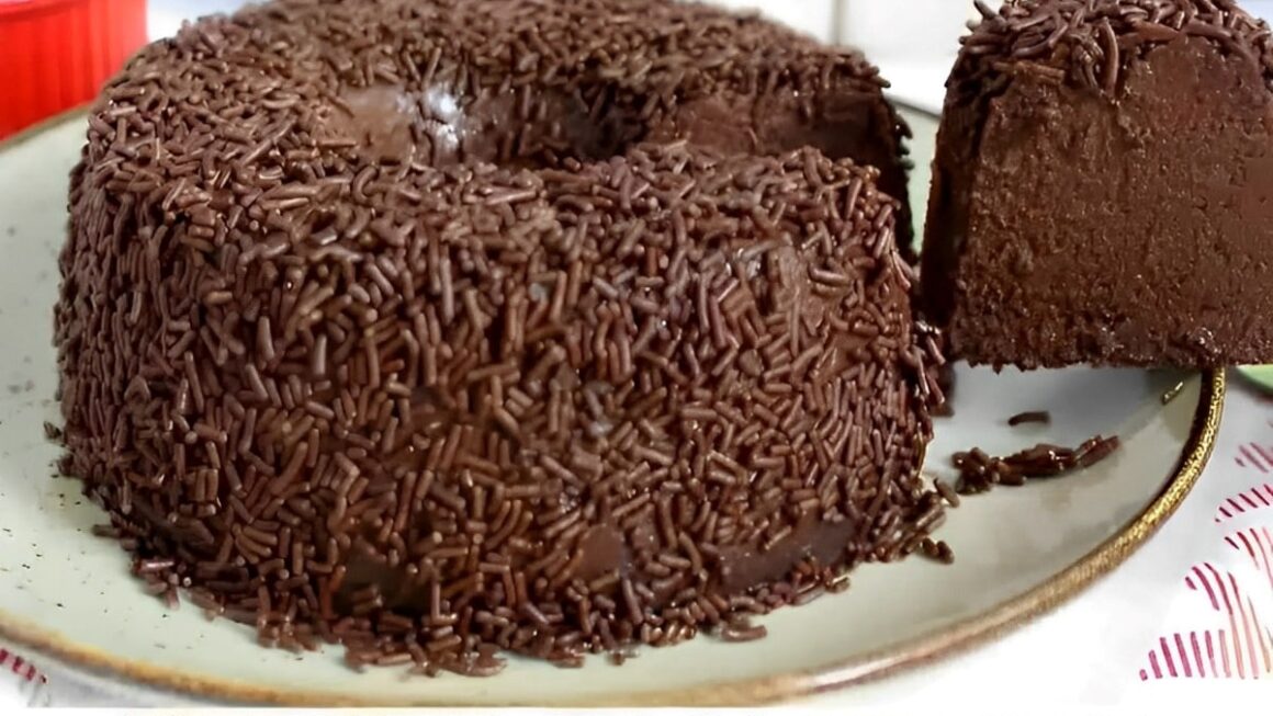 - Após desenformar, decore com granulado de chocolate, sirva e desfrute do seu sensacional brigadeirão bem gelado!