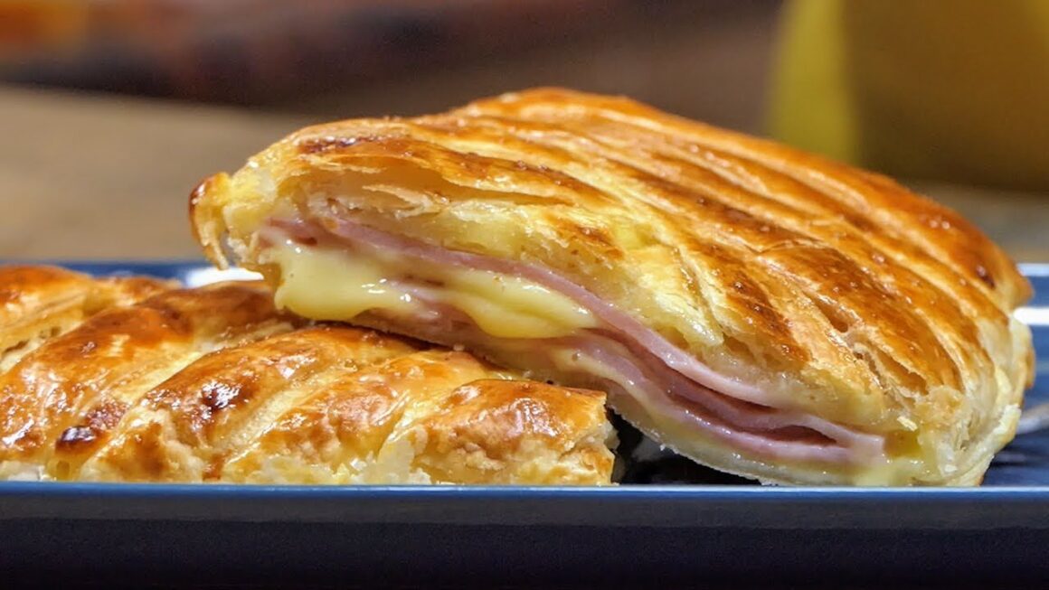 - Espalhe a massa folhada. Disponha no meio, alternando um pedaço de queijo amarelo, um pedaço de presunto.