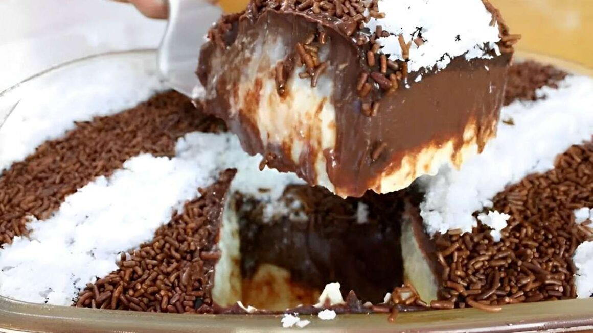 - Enfeite com faixas diagonais de coco ralado e também com o granulado de chocolate. Coloque na geladeira durante 2 horas.