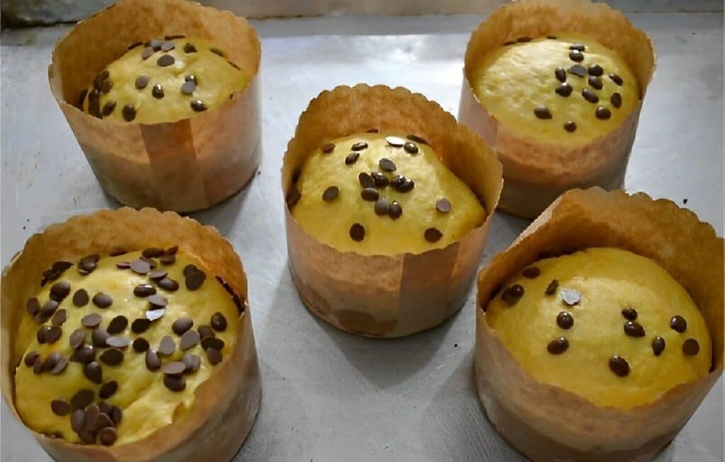 3. Adicione as gotas de chocolate e preencha com essa mistura as 10 forminhas forneáveis para panetone de 100 gramas.