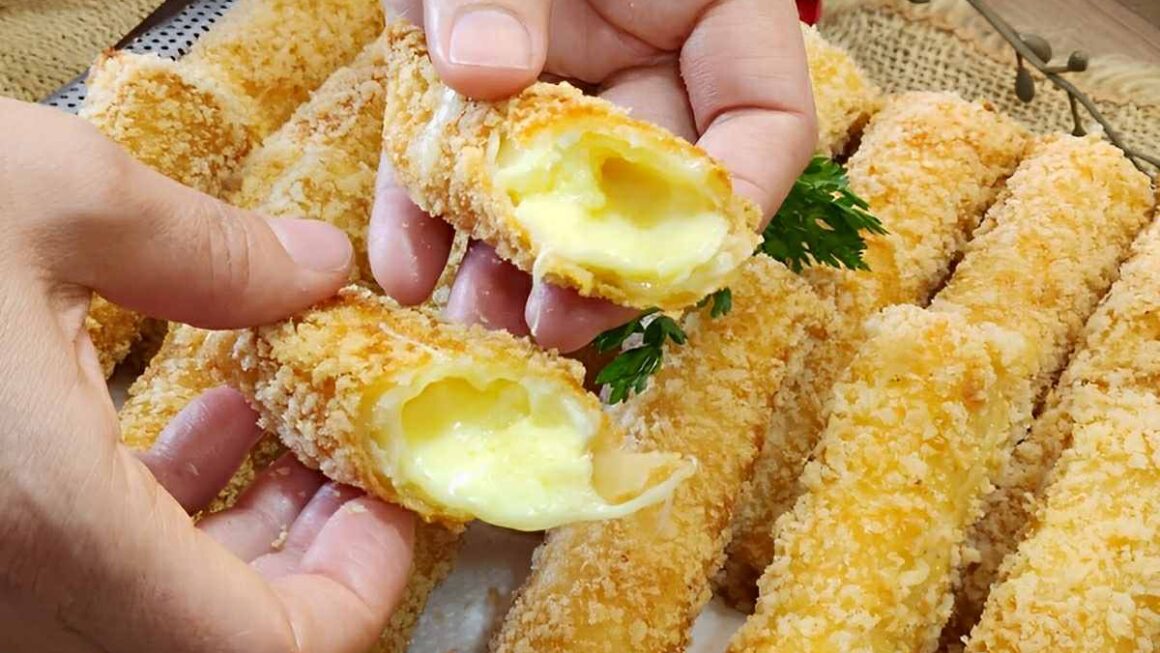 - Crie bastões de queijo com a largura de aproximadamente 1 dedo mindinho. Reserve.