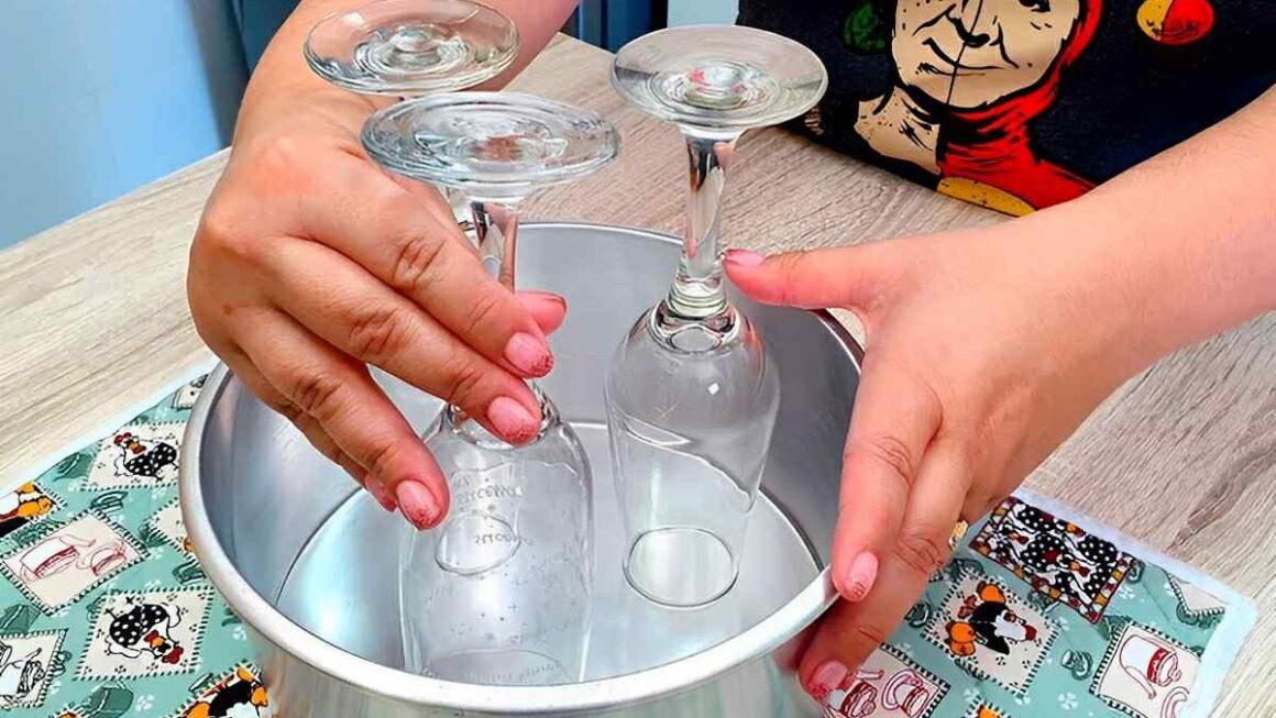 6. As taças emborcadas dentro da forma, irão ajudar a criar o efeito “mesclado” ao colocar a massa.