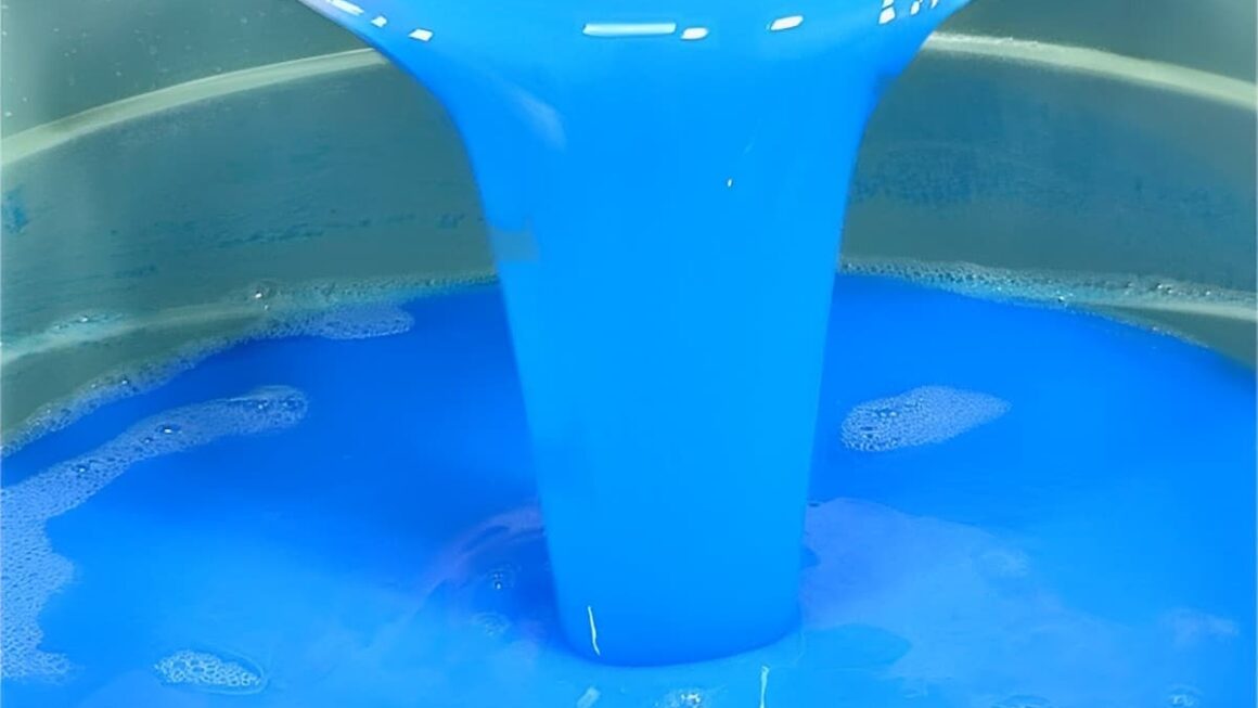 - Em seguida, adicione a água em temperatura ambiente, o detergente azul, o sal dissolvido na água e o amaciante.
