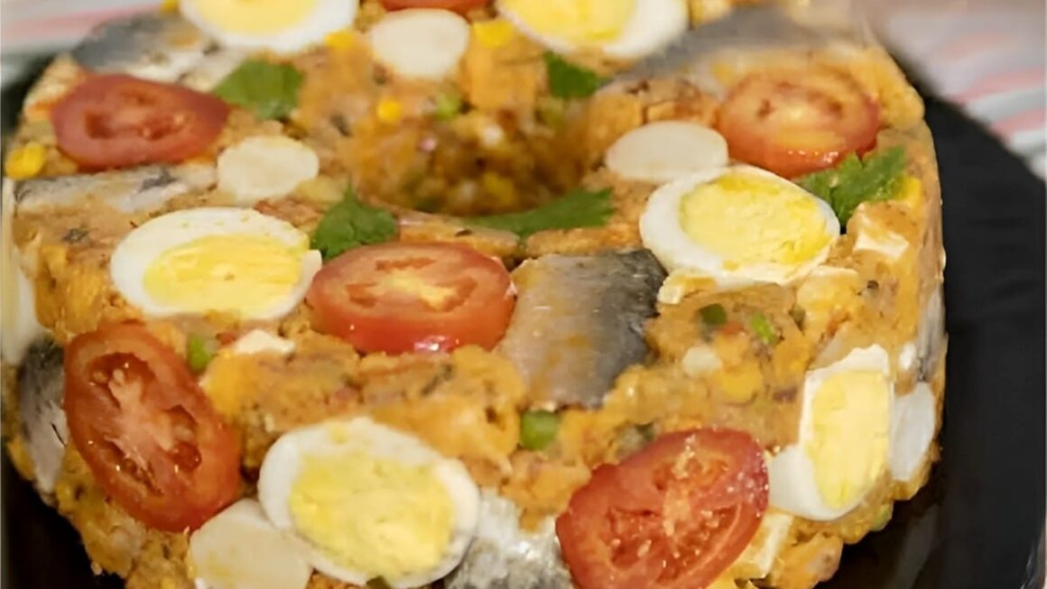 Para a receita do cuscuz paulista, utilizaremos: milho-verde em conserva, sardinha com o óleo, palmito, farinha de milho, ovos, tomate, cebola, azeitonas, azeite, tempero baiano, páprica, alho, pimenta-dedo-de-moça, sal, salsa, cebolinha e ervilha em conserva. Vamos conferir direitinho o passo a passo da preparação do cuscuz e da montagem na forma de buraco no meio, ligeiramente untada com azeite. Posteriormente, colocaremos o cuscuz na geladeira durante 2 horas. Após esse tempo, tiraremos da geladeira e desenformaremos. Sirva e deguste seu saboroso cuscuz paulista!