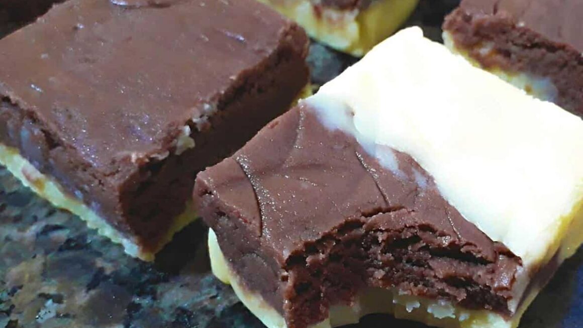 6. Na metade de um refratário, untado com manteiga, coloque metade do doce branco, e cubra com o doce de chocolate. Disponha na outra metade o restante do doce branco.