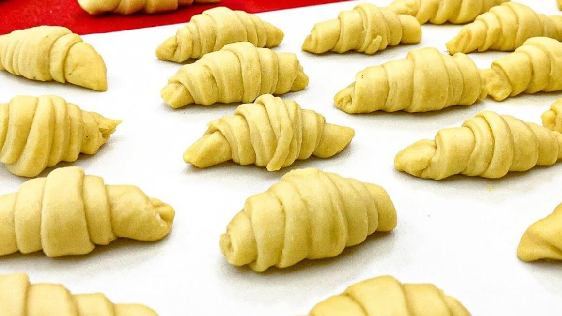 - Abra a massa com o rolo, meça 3 dedos de largura e corte triângulos, enrolando-os da parte mais larga para a mais fina, fazendo os pãezinhos e dispondo-os numa travessa.