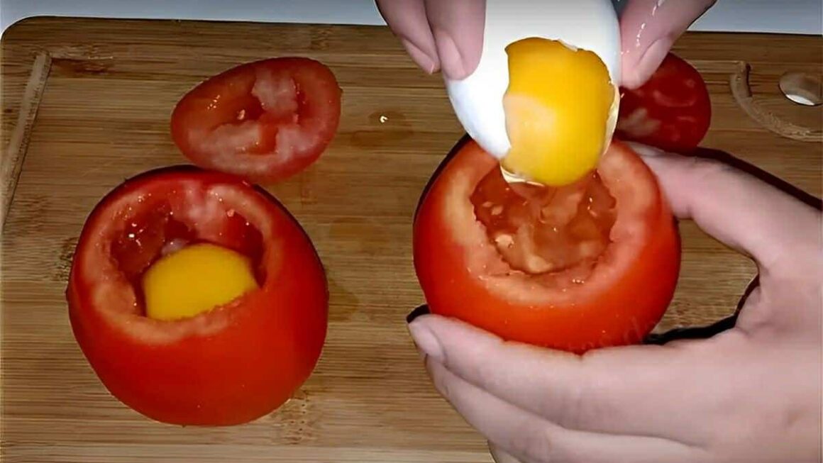 - Adicione um fio de azeite e coloque o ovo cru no interior do tomate. Utilize: sal, orégano e o tempero baiano para temperar.