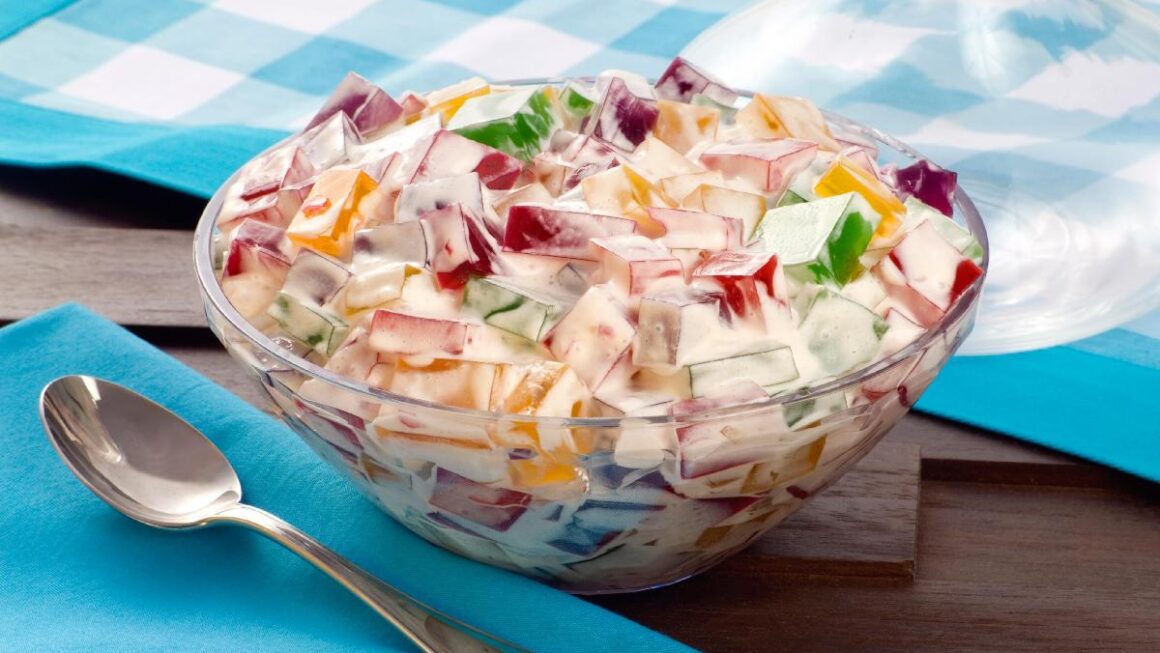Corte em cubos, coloque em uma tigela e misture para que fique bem colorido. Na batedeira, bata o creme de leite fresco por 5 minutos ou até ficar como chantilly. Retire da batedeira, misture com o leite condensado, misture aos cubos de gelatina e sirva.