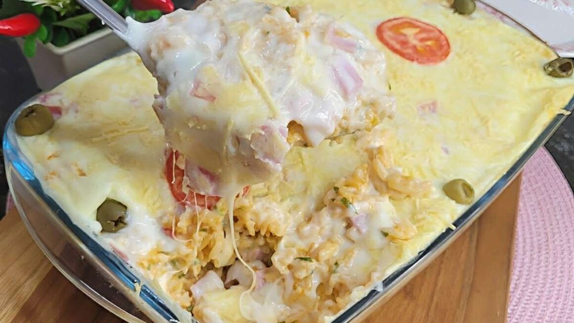Para fazer receita com arroz amanhecido vamos precisar de mussarela, presunto, queijo parmesão ralado, sobras de arroz cozido, cebola, tomate, alho amassado, molho de tomate pronto, chimichurri, orégano, colorau, açafrão, sal, cheiro verde, azeite, azeitonas e tomate fatiado. Para dar continuidade no preparo da receita com arroz amanhecido teremos que seguir corretamente a sequência do passo a passo tanto do preparo do arroz, do molho branco, como também da montagem no refratário. Depois disso iremos levar o refratário com a receita com arroz amanhecido para gratinar em forno pré-aquecido a 180 graus, retirar, e servir em seguida essa gostosura de receita com arroz amanhecido!