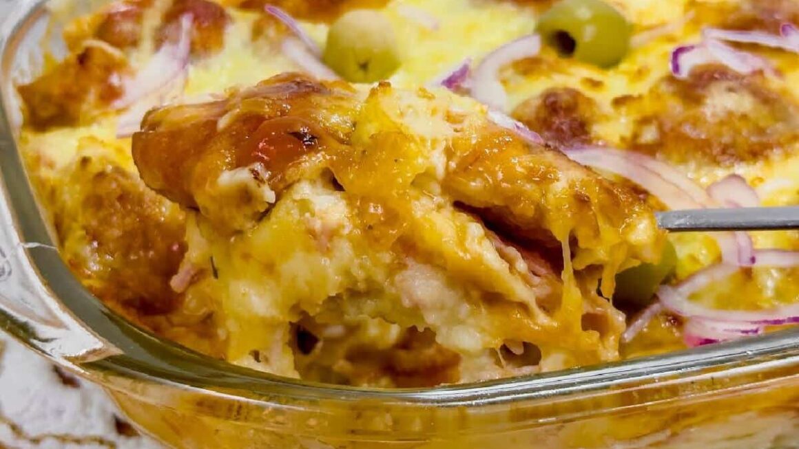 - Disponha o puré num refratário, coloque o presunto ralado, o frango frito, o molho de tomate, a mussarela fatiada e o queijo coalho ralado.