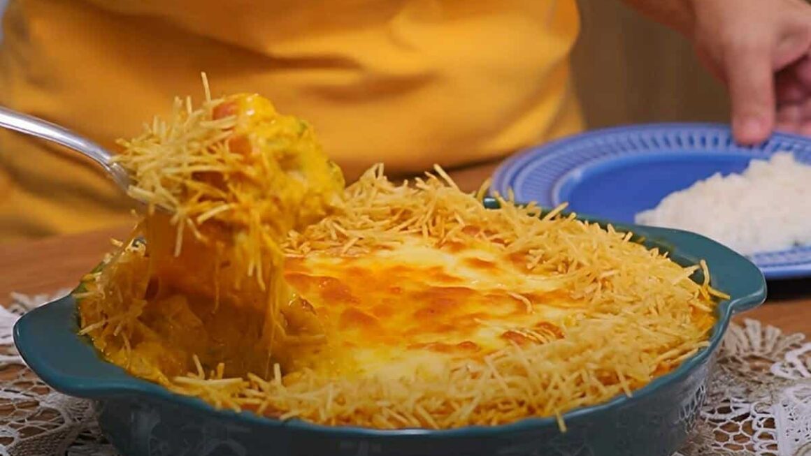 - Retire do forno, polvilhe batata palha a gosto, e sirva essa delícia de fricassê de frango!