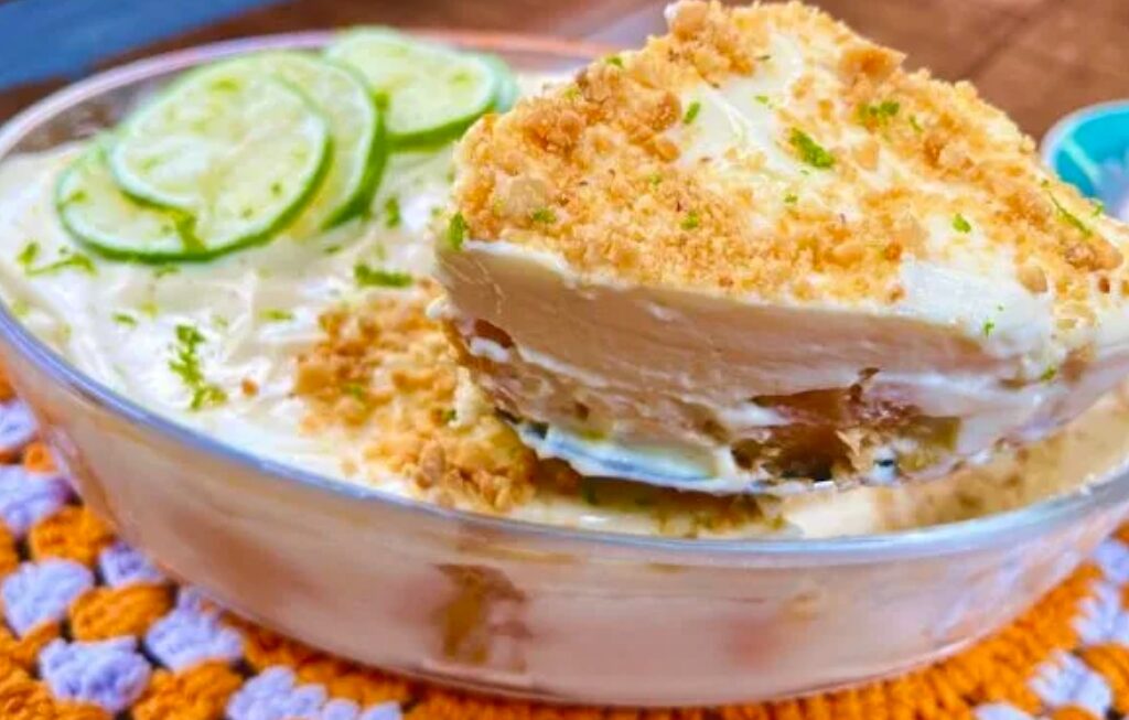 - Em uma travessa de vidro (26cm de comprimento), despeje parte do creme de limão, distribuindo de forma uniforme.