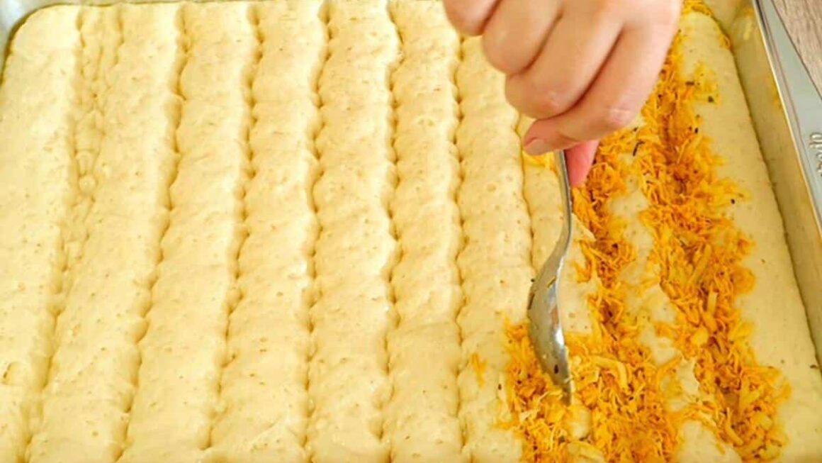- Depois da massa descansar vamos com os dedos untados com óleo fazer um “caminho” em um lado ao outro da forma no sentido da largura da forma. Deixe espaço de cerca de 3 centímetro de um para o outro.