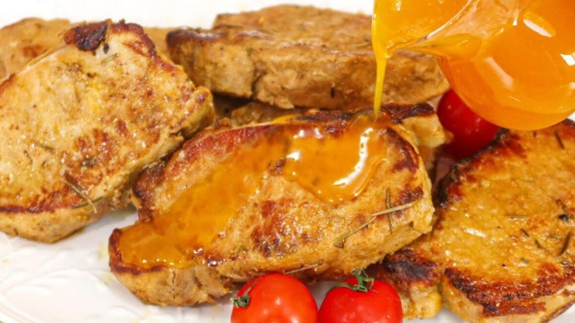 - Disponha os bifes de lombo numa assadeira forrada com papel alumínio, um ao lado do outro, e regue com o molho de laranja.