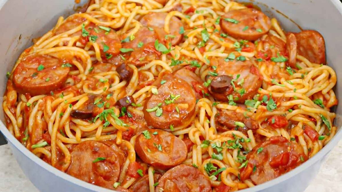 5. Junte o macarrão cozido ao molho e saboreie essa delícia de macarronada de calabresa!