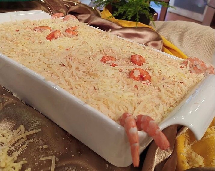 Assim que o creme de camarão ficar pronto, começamos a montagem com a mussarela, em seguida, o creme, e, por cima, a mussarela seguida do queijo parmesão ralado.