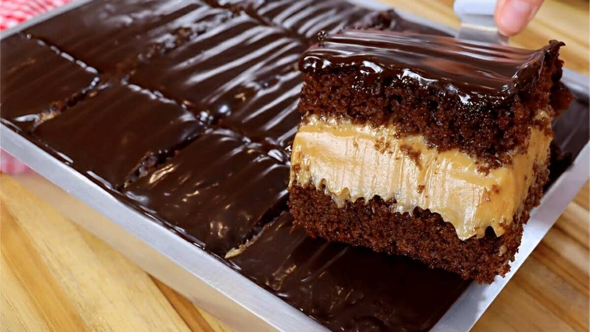 - Divida o bolo em 2 metades. Coloque uma metade na forma onde foi assado, e regue com a calda. Disponha o recheio de doce de leite e espalhe bem para uniformizar.