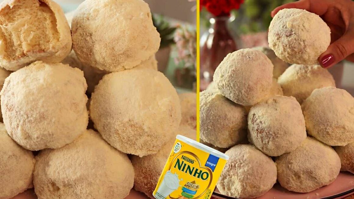 Para fazer esse pão nuvem de leite ninho vamos usar ingredientes que provavelmente você tem em casa, como fermento biológico seco, leite, açúcar, leite em pó, ovo, manteiga sem sal, farinha de trigo, sal, e leite condensado. O modo de preparo desse pão nuvem de leite ninho é bem simples! Primeiro, preparamos a massa e deixamos descansar por 30 minutos. Fazemos bolinhas e levamos para assar por 35 minutos depois de deixar descansar 15 minutos sobre uma assadeira enfarinhada. Passamos os pães em uma calda de leite e empanamos em leite em pó, provando essa delícia em seguida!