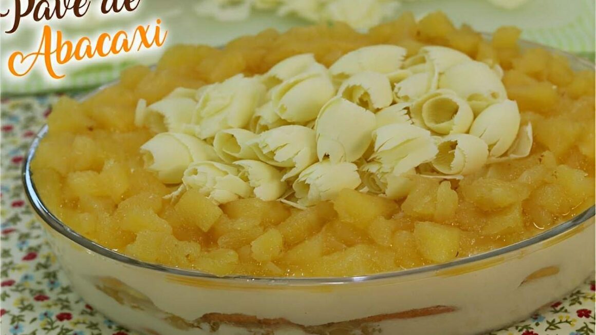 Para fazer pavê de abacaxi vamos precisar para o doce de abacaxi, de suco de limão, açúcar cristal e abacaxi cortado em cubinhos. Para o creme do pavê de abacaxi iremos utilizar leite condensado, creme de leite, leite e maisena. Para fazer a montagem do pavê de abacaxi vamos intercalar num refratário, camadas de creme, biscoito champagne e doce de abacaxi, mas a última camada deverá ser de creme. Para finalizar iremos dispor uma camada de doce de abacaxi em toda a lateral e decorar com raspas de chocolate branco no centro. Levar o pavê de abacaxi para gelar por 3 horas, retirar da geladeira e saborear cada porção suculenta desse incrível pavê de abacaxi!