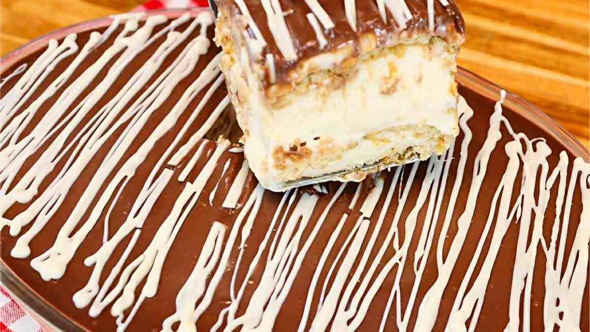 2. Despeje essa ganache sobre o creme na travessa e espalhe bem. Leve para gelar até o dia seguinte, retire da geladeira e decore com linhas de chocolate branco.