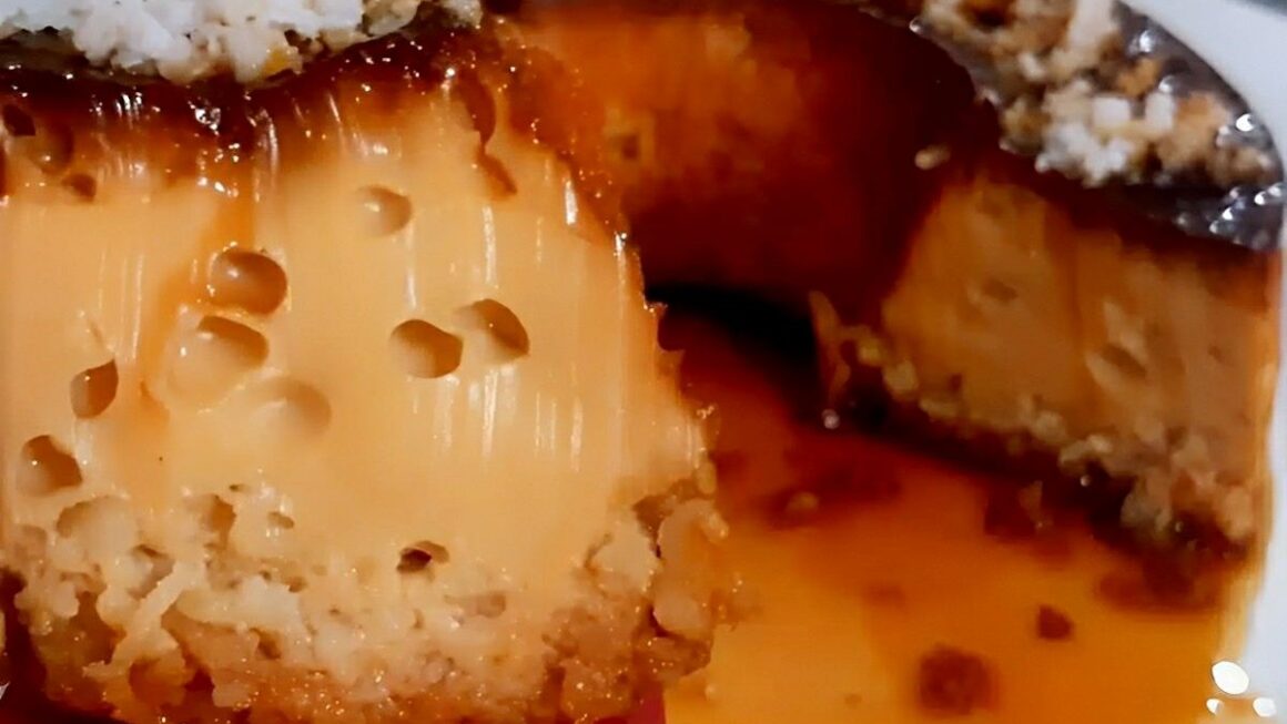 - Espalhe essa calda de caramelo no fundo, e nas laterais de uma forma com 20cm de diâmetro e buraco no meio. No fundo da forma, salpique o coco ralado fresco a gosto por cima do caramelo. É opcional o acréscimo do coco ralado fresco.