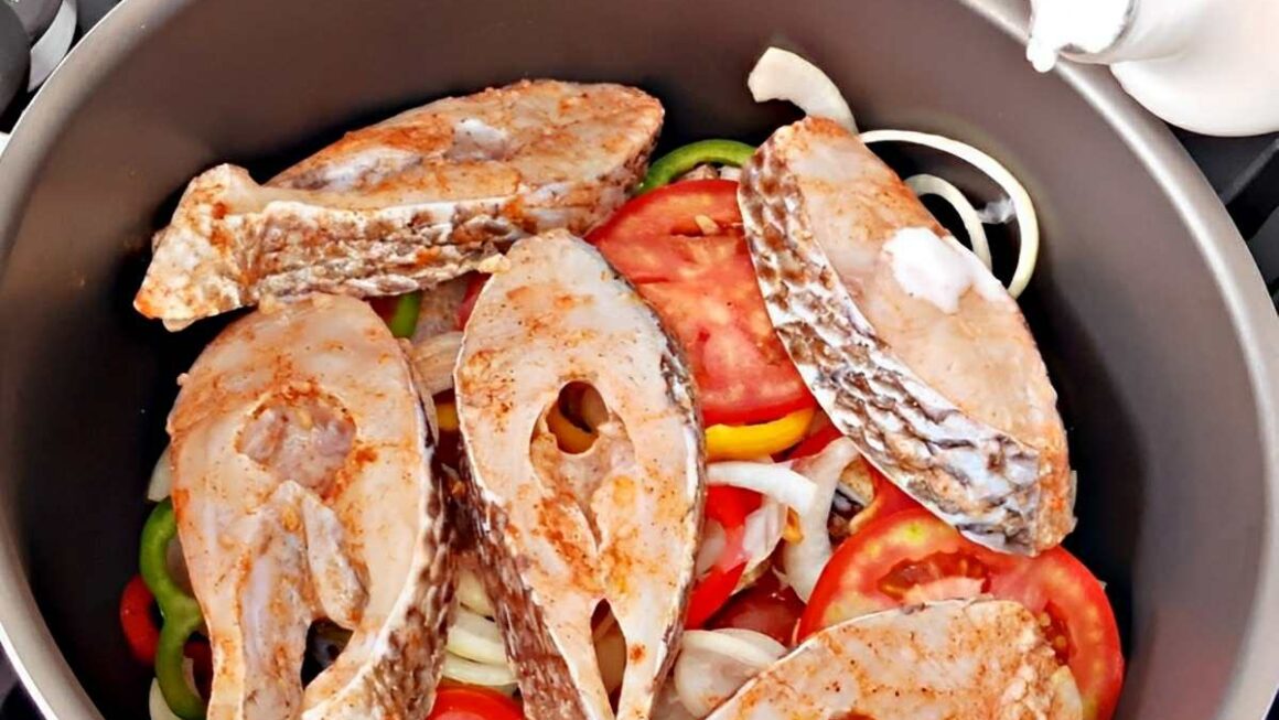 - Em uma panela, coloque camadas de rodelas de pimentão, cebola, tomate e postas de tilápia.