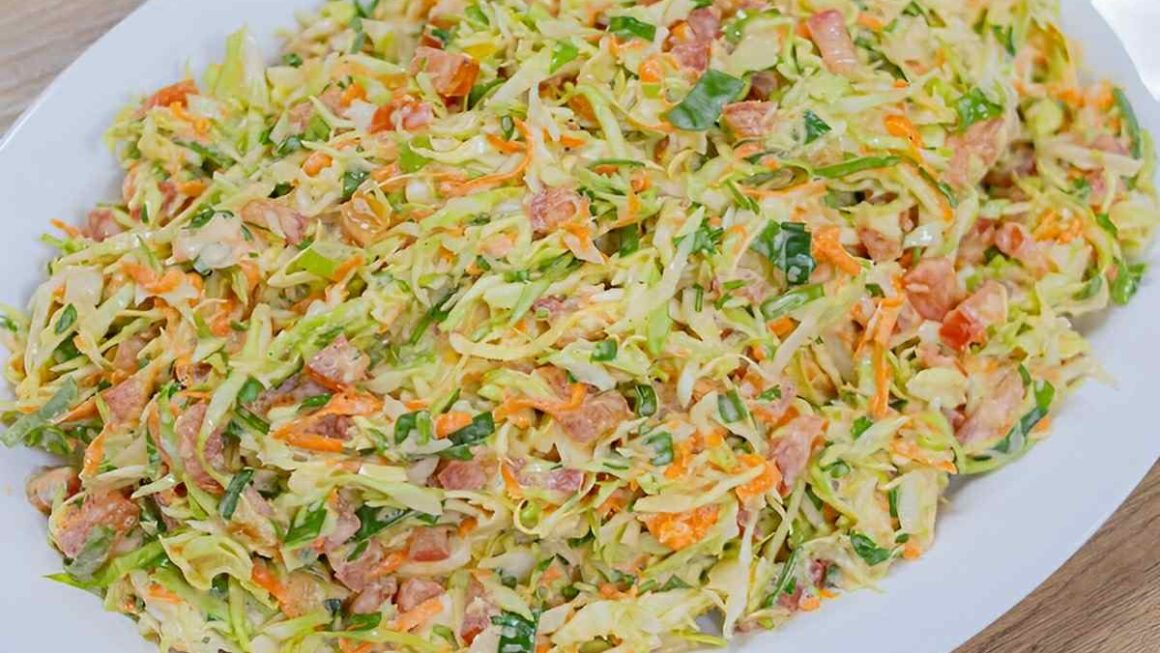 Para fazer essa salada de repolho vamos precisar de ingredientes que provavelmente você tem em casa, como repolho verde, cenoura, tomate, limão, maionese, cheiro-verde, pimenta-do-reino, e sal. Preparar essa salada cremosa de repolho é muito simples! Primeiro, misturamos os vegetais e depois incorporamos os temperos, deixando a maionese por último. Transferimos a salada cremosa de repolho para uma travessa de servir e levamos para a geladeira, tirando somente na hora de servir. Aí você poderá saborear essa delícia!