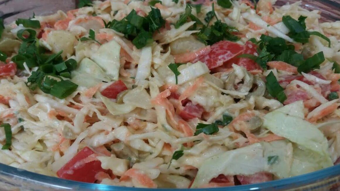 - Juntamente ao repolho, acrescente: as batatas em cubos, os tomates picados, a cenoura e a cebola raladas, as azeitonas, o suco de limão, azeite, pimenta-do-reino, cheiro-verde picado (reserve um pouco para finalizar), o requeijão cremoso, a maionese e sal a gosto.