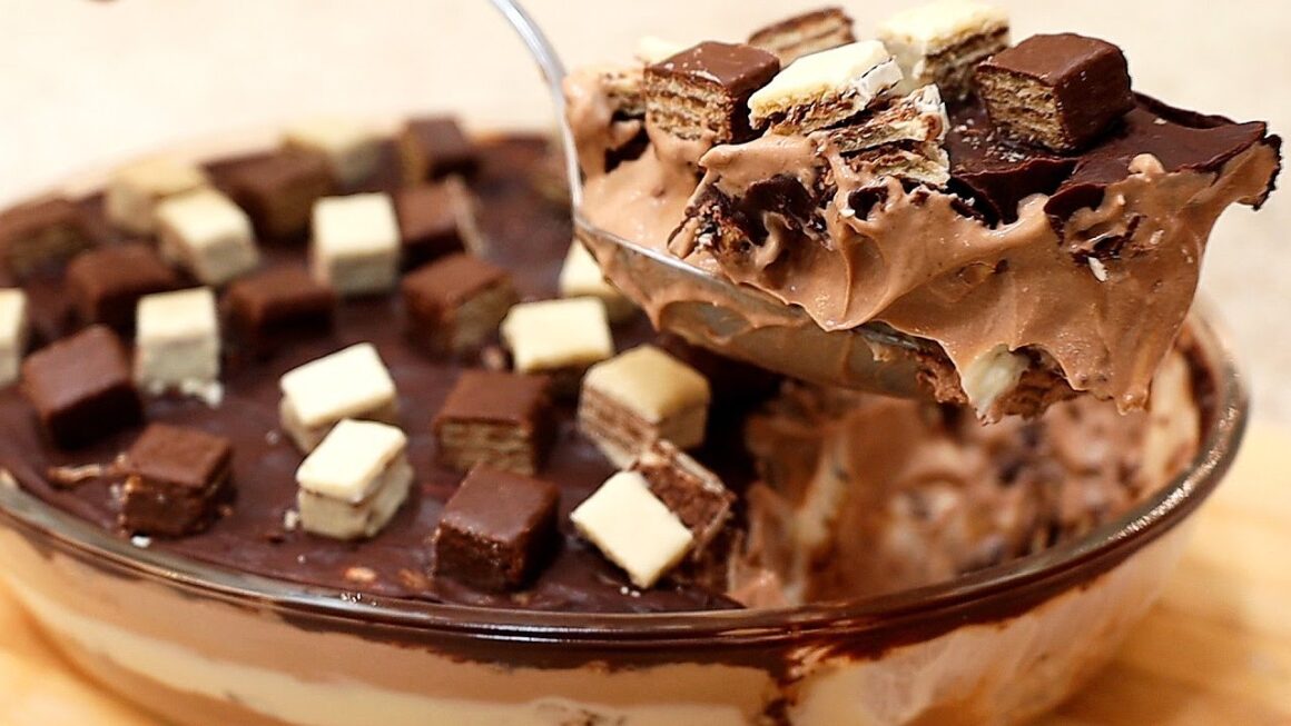 Para fazer sobremesa de páscoa simples teremos que preparar algumas etapas durante o processo que são: a mousse de chocolate ½ amargo, a mousse de chocolate branco, a mousse de chocolate ao leite e a cobertura ganache. Iremos seguir corretamente a sequência do passo a passo tanto do preparo das mousses da sobremesa de páscoa simples, quanto da cobertura e da montagem. Vamos finalizar o preparo da sobremesa de páscoa simples dispondo a cobertura ganache e decorando com chocolate bis picado. Levar para gelar por 20 minutos no freezer ou 2 horas na geladeira, retirar e servir esse espetáculo de sobremesa de páscoa simples!