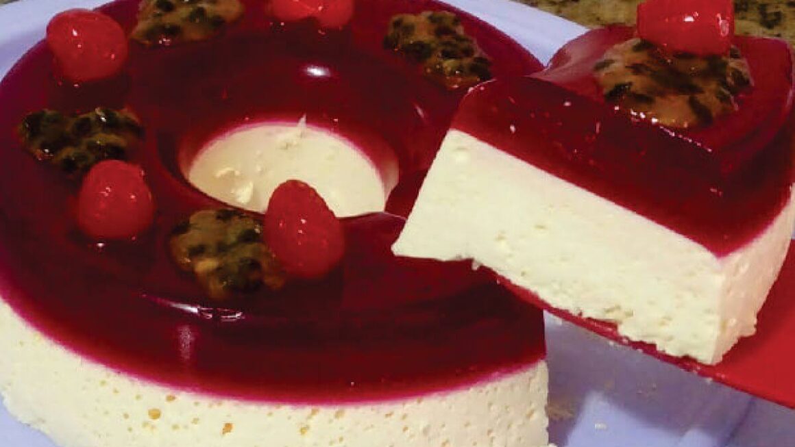 - Ao retirar, desenforme e decore com cerejas em calda e polpa de maracujá.