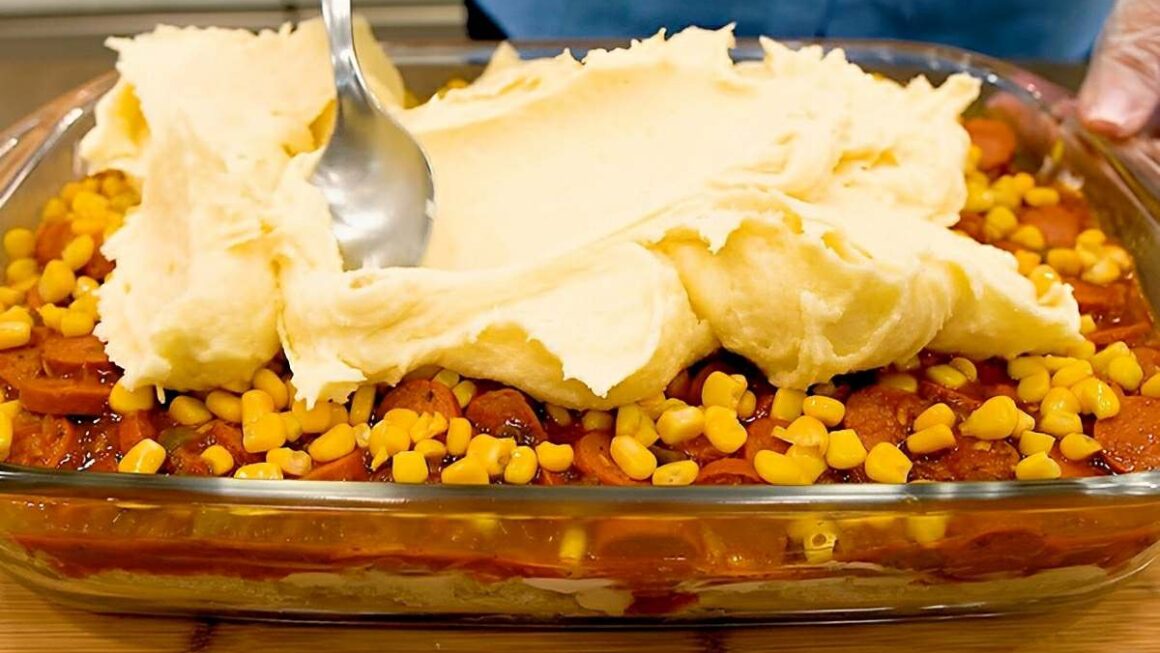 7. Cubra as salsichas com o milho verde, o purê de batata, o molho das salsichas e o queijo muçarela.