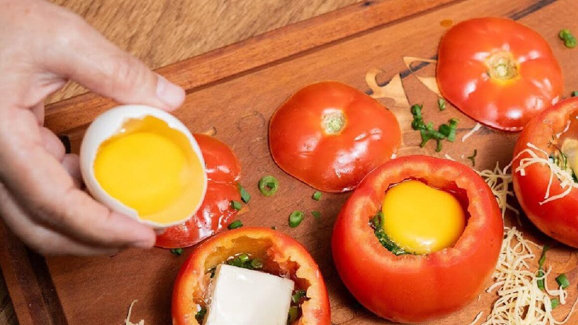 - Tempere os tomates com sal, pimenta-do-reino, disponha um queijo Polenguinho dentro de cada tomate, salpique com salsinha e cebolinha picadas, e acrescente um ovo cru, cuidadosamente.