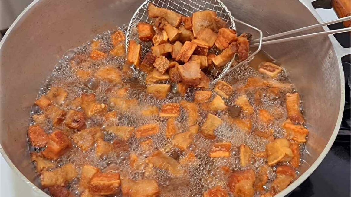 - Para fritar o courinho que ficou reservado, é fundamental aguardar a gordura que ficou na panela esfriar.