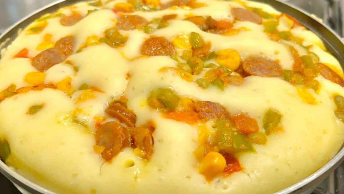 Para a receita da nossa torta salgada com massa de maisena, comece preparando o molho. Em uma panela frite a linguiça, adicione a cebola, alho, tomate, pimentão, milho e ervilha e deixe cozinhar. Para a massa, o segredo é a cada vez que adicionar um ingrediente, mexa bem. Comece batendo os ovos, depois vá adicionando na ordem o sal, óleo, leite, farinha, amido de milho e por fim o fermento em pó. Despeje metade da massa em uma frigideira, coloque uma parte do recheio e queijo muçarela. Então cubra com o restante da massa e recheio. Leve em fogo baixo até cozinhar, vire e deixe dourar por aproximadamente 3 minutos. Retire da frigideira, sirva-se e bom apetite!