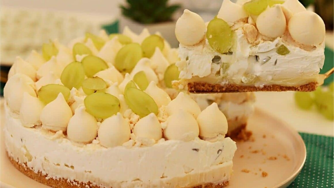 - Na hora de servir, decore a torta com os suspiros e com mais uvas Thompson, se preferir.