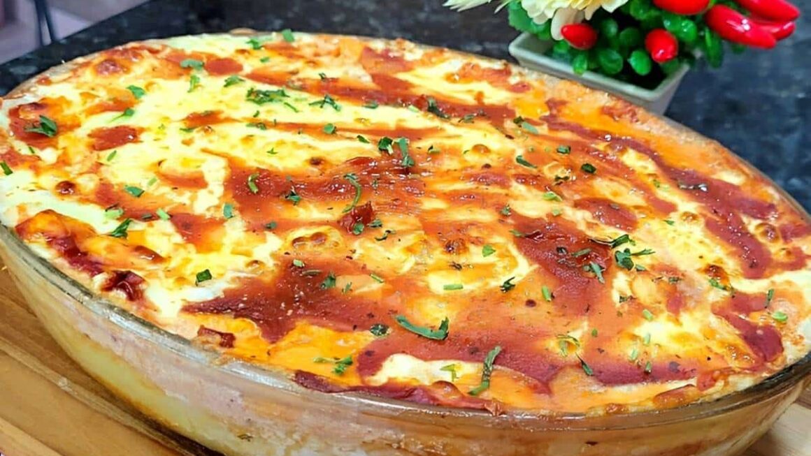 - Coloque uma camada de purê num refratário, adicione o molho de tomate, o presunto fatiado, o creme de leite, a mussarela e o purê novamente.