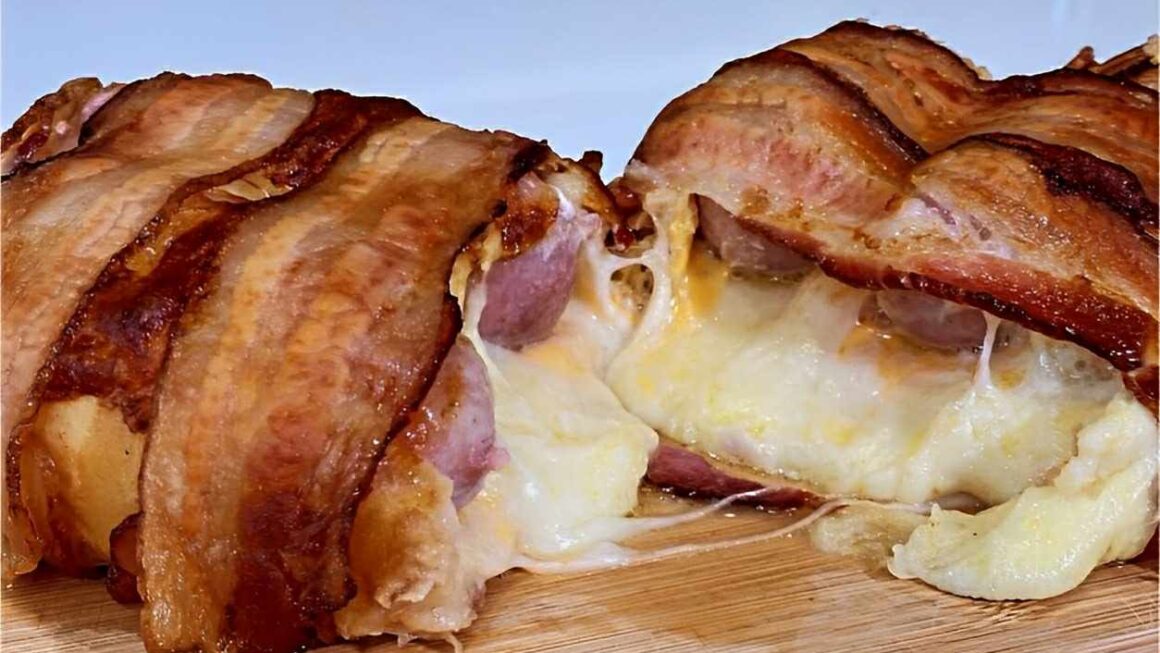 Para fazer essa delícia vamos precisar de mussarela fatiada, mussarela ralada, linguiça toscana pré cozida, queijo cheddar fatiado, queijo cheddar cremoso, pão francês e bacon fatiado. Iremos primeiramente remover o miolo do pão francês. Em seguida vamos dispor os ingredientes do recheio do pão francês seguindo a sequência de adição. Para finalizar a montagem iremos cobrir toda a superfície com as fatias de bacon e prender as bases com palitos de dente. Na sequência vamos levar o pão francês recheado para assar na cestinha da airfryer, pré-aquecida a 200 graus por aproximadamente 15 minutos. Retirar da cestinha e saborear cada pedacinho gostoso dessa delícia!