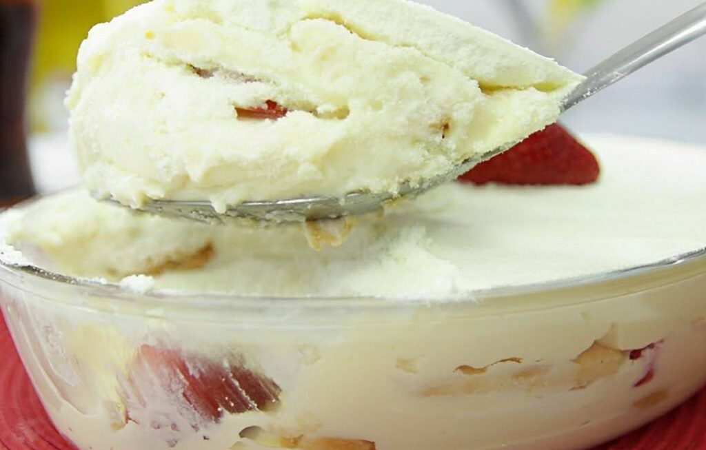 - Para a montagem, pegue uma travessa de vidro e faça uma camada de creme, seguida de biscoitos umedecidos no leite, mais uma vez creme e depois morangos fatiados.
