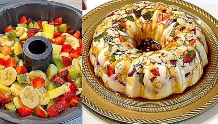 - Em uma travessa previamente untada com um pouco de óleo, disponha as frutas de maneira aleatória, alternando entre morangos, kiwi e as demais frutas reservadas.