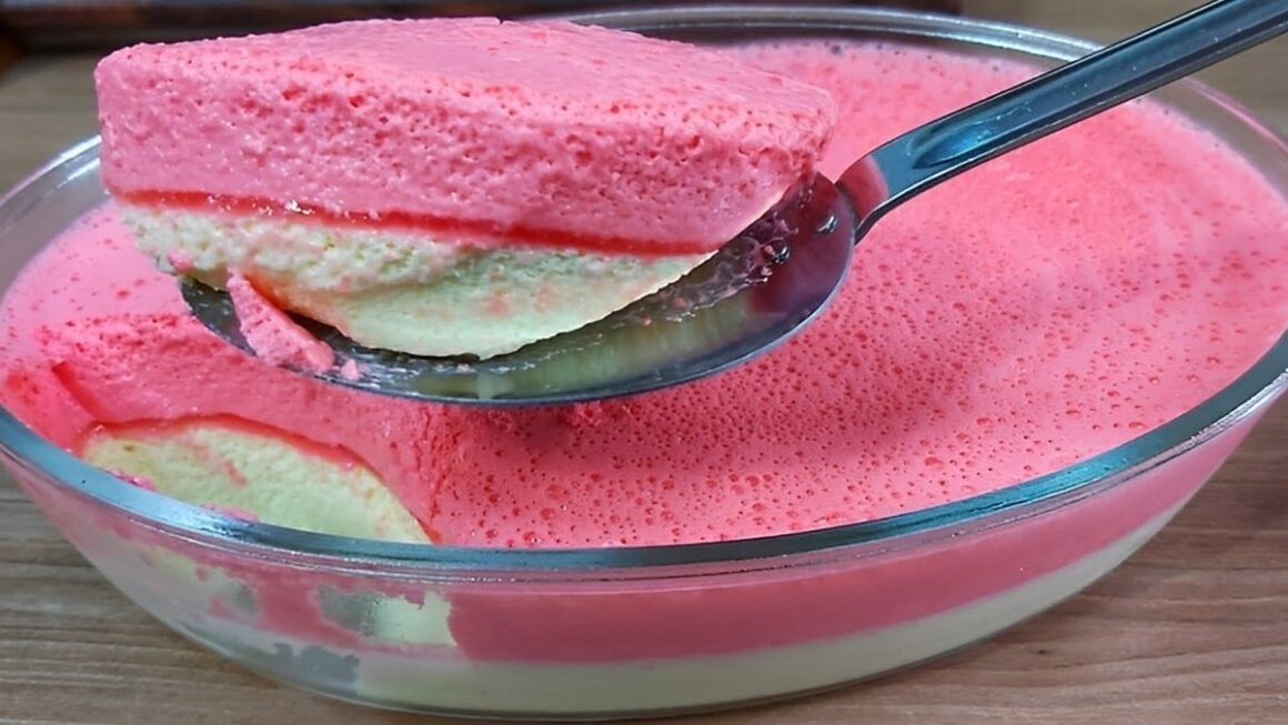 Para fazer essa sobremesa iremos precisar de água quente, creme de leite, gelatina sabor abacaxi e sabor morango. Primeiramente iremos dissolver a gelatina de abacaxi na água quente e depois bater com o creme de leite no liquidificador. Vamos dispor essa mistura, numa travessa e levar essa 1ª. camada da sobremesa gelada para gelar por 2 horas. Iremos fazer o mesmo processo com a gelatina de morango, retirar a sobremesa gelada da geladeira e dispor a 2ª camada por cima. Gelar novamente por mais 2 horas, e servir em seguida a mais espetacular sobremesa gelada que você já provou!