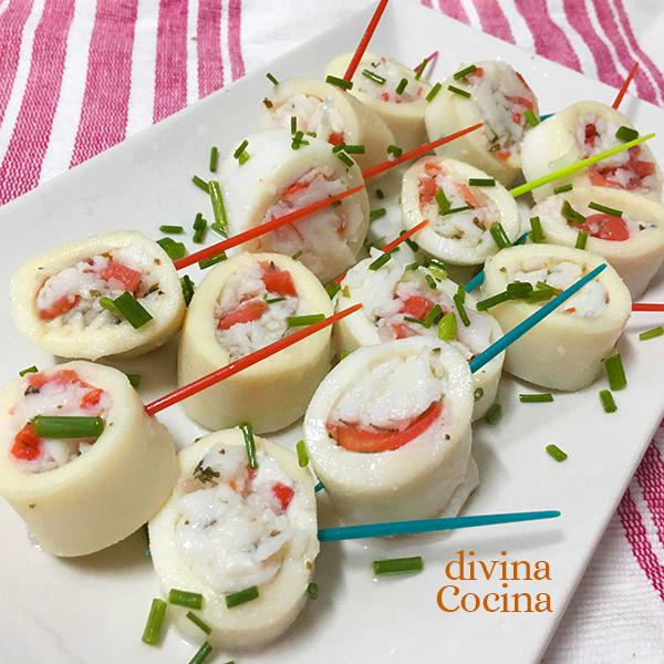 Estos calamares rellenos fríos para aperitivos son perfectos en ocasiones especiales. Se sirven como pinchos, troceados y acompañados de salsas a tu gusto, mayonesa, salsa tártara o salsa rosa.