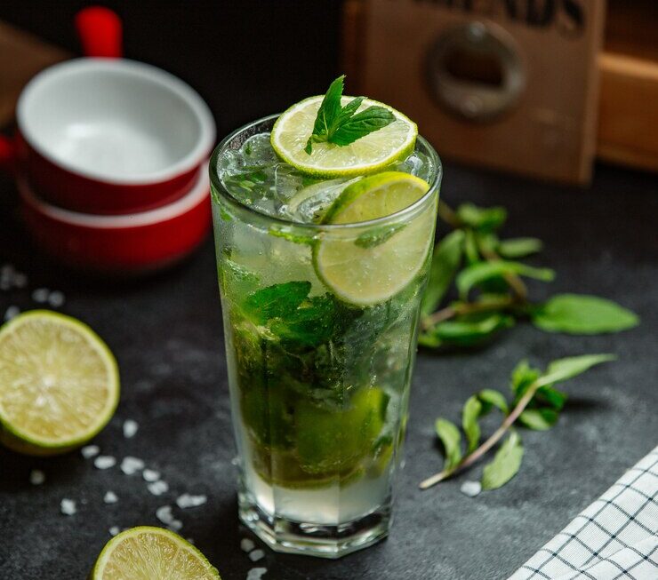 Ingredientes: 2 oz (60 ml) de ron blanco, 1 oz (30 ml) de jugo de limón fresco, 2 cucharaditas de azúcar, Un puñado de hojas de menta fresca, Agua con gas (soda), Limón en rodajas, Hielo.