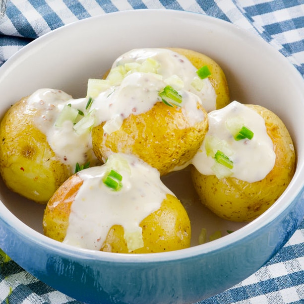- Una vez asadas las patatas ya podemos retirarlas y servirlas al momento, abiertas al medio (si son patatas grandes), como guarnición de carnes o pescados.