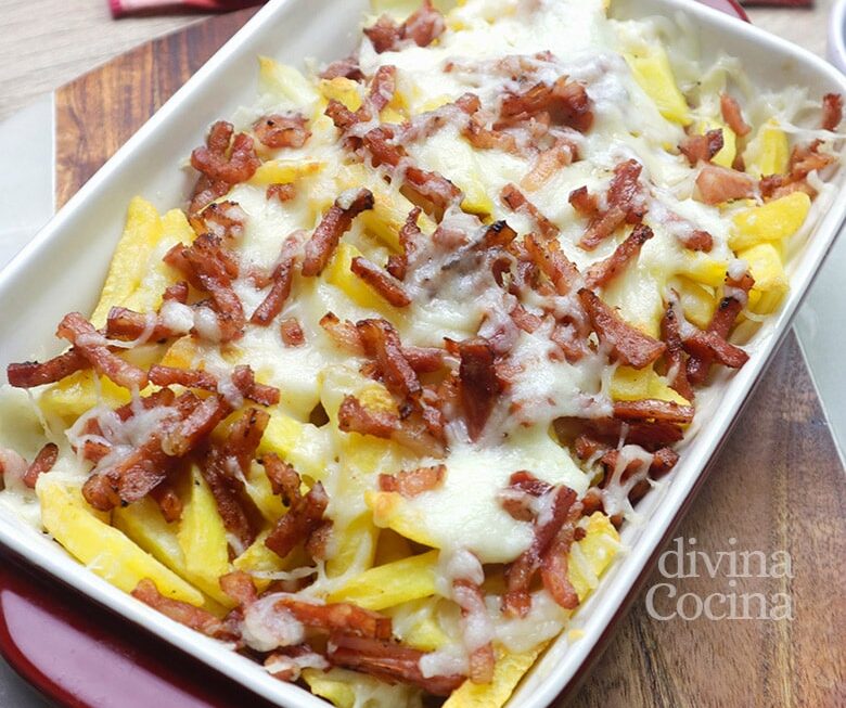 4. Ponemos las patatas fritas y calientes en una fuente de servicio que pueda entrar al horno. Sobre las patatas añadimos la mitad del queso y lo mezclamos con las patatas. Cuando esté bien mezclado cubrimos con la otra mitad del queso y el bacon ya ligeramente salteado.