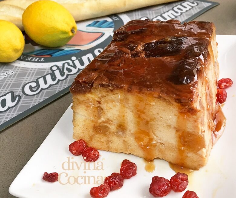 - Ponemos en un molde caramelizado y hacemos en el horno (180º) al baño María tapado con aluminio por 30 min. Comprobamos con una aguja que el pudding de manzanas está bien cuajado y dejamos templar antes de desmoldarlo.