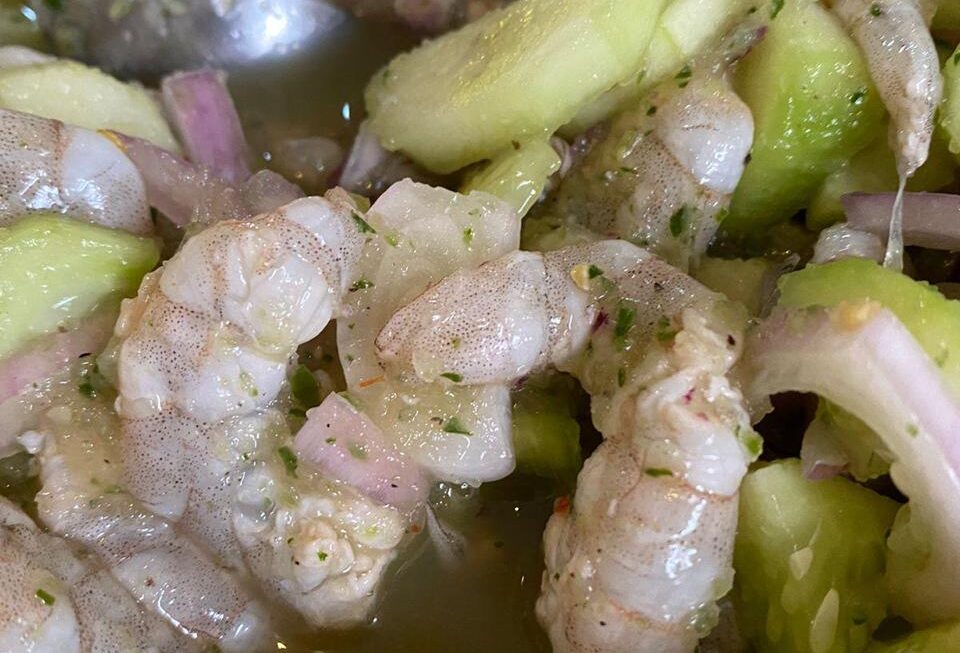 Ingredientes: 500 g de camarones grandes, pelados y limpios, 5 limones (jugo), 3 limas (jugo), 1 pepino, pelado y cortado en rodajas delgadas, 1/2 cebolla morada, cortada en rodajas muy finas, 1 manojo de cilantro fresco, picado, 2 chiles serranos, sin semillas y picados (ajusta según tu preferencia de picante), 1 aguacate, cortado en cubos, Sal al gusto, Pimienta al gusto, Tostadas o galletas saladas para servir.