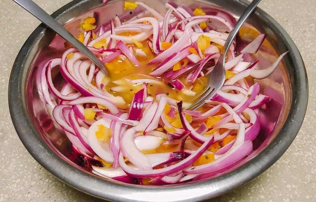 Ingredientes: 1 cebolla morada, cortada en rodajas finas, 1-2 chiles habaneros, finamente picados (ajusta según tu tolerancia al picante), 1 taza de vinagre de sidra de manzana, 1 cucharada de azúcar, 1 cucharada de sal, 1 taza de agua.
